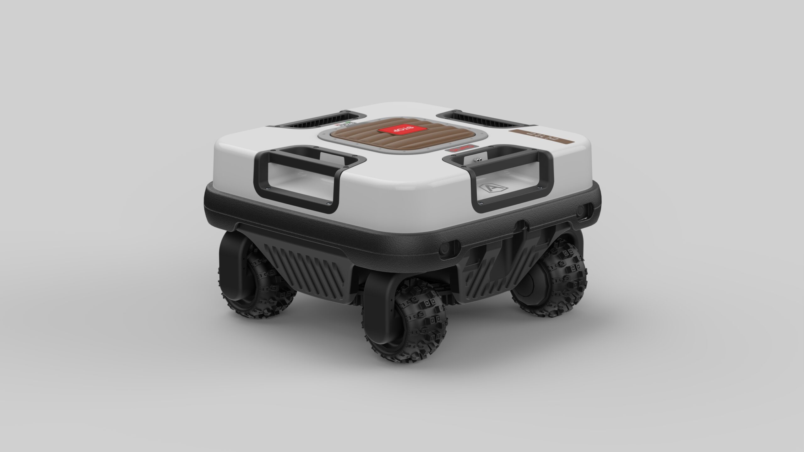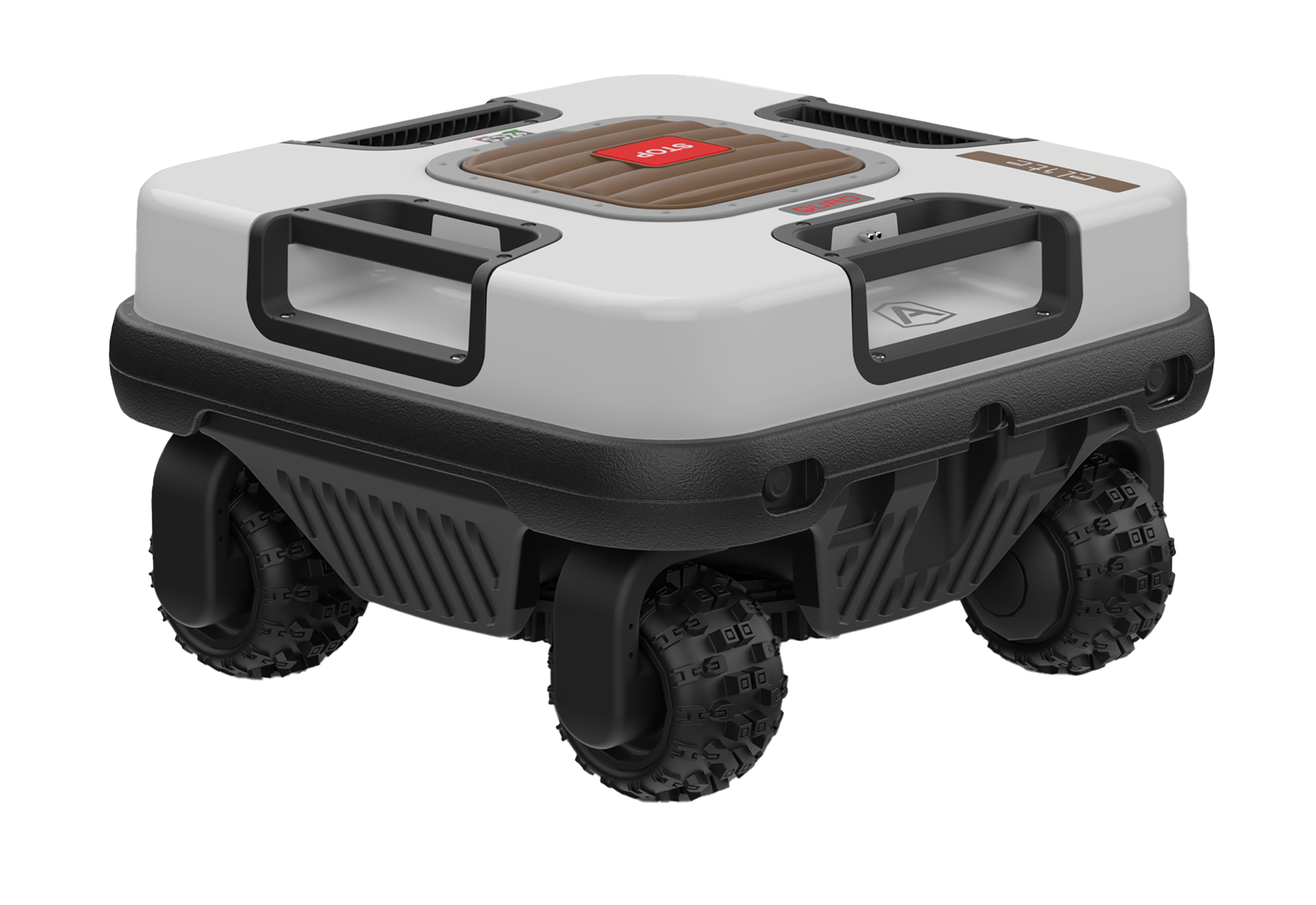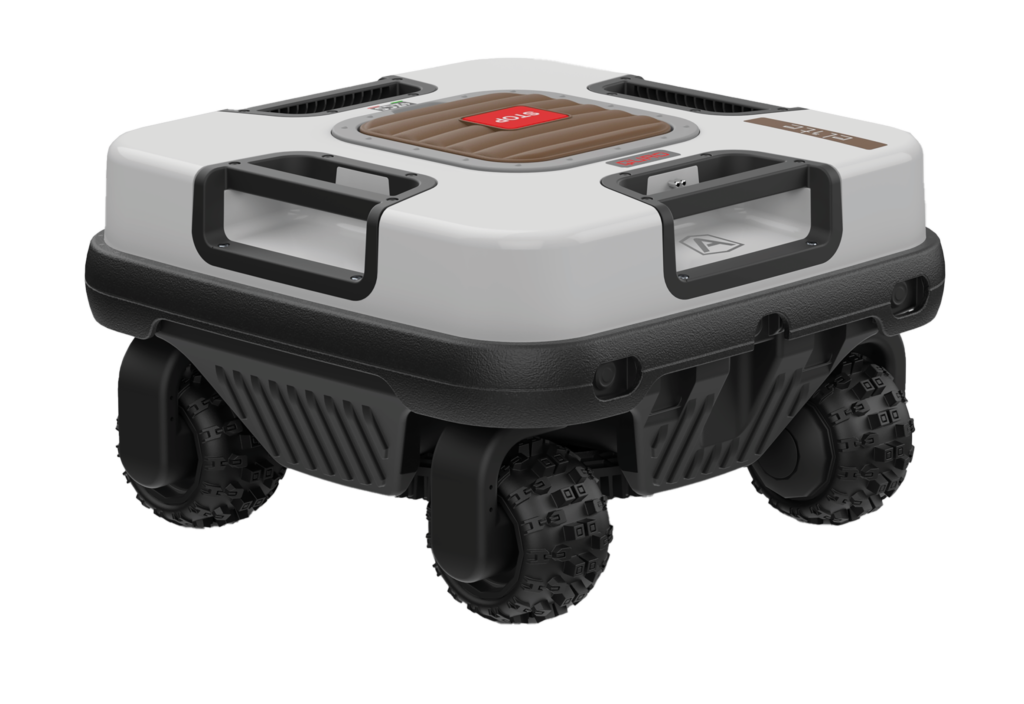 Napędzany czterema indywidualnie sterowanymi kołami oraz 10 Ah baterią robot może pokonywać strome pagórki (75%) i pracować przy obrzeżach nachylonych do 65%.